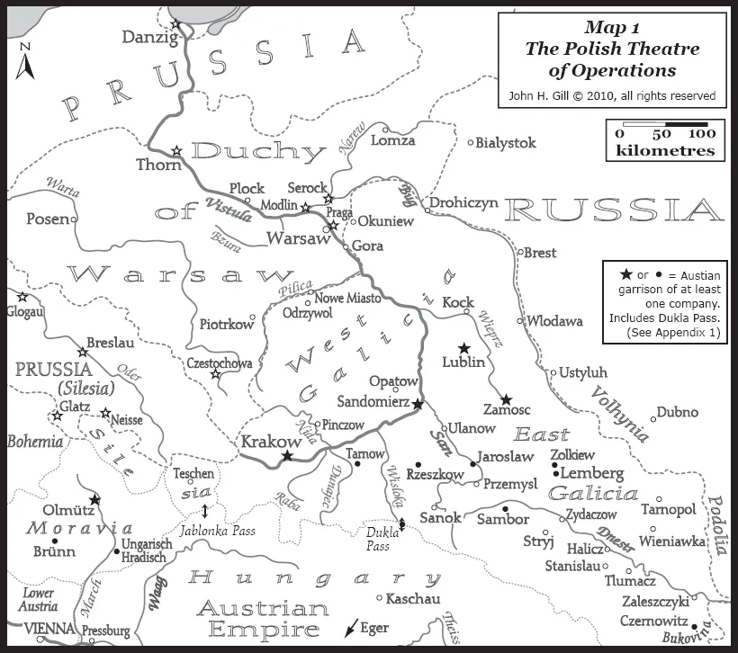 Though the Austrians enjoyed broad advantages in training, experience, and numbers, VII Corps lacked a bridging train.11 This would prove a serious deficiency in a theatre dominated by the broad Vistula and intersected by numerous smaller watercourses. Given that Sandomierz was the only fortified crossing over the Vistula between Krakow and Warsaw, âprudence commanded him [Ferdinand] to make himself master of the Vistula,â as Polish Captain Roman Soltyk noted in his history of the war.12 A secure crossing site with fortified bridgeheads on both banks could have been constructed before the war (albeit at the risk of provocation) as âa pivot for his operationsâ, to permit VII Corps to operate either west or east of the great river with equal facility.13 Instead, Ferdinand, with no bridging equipment, found his operations confined to the western (left) bank and he only gave thought to a suitably sited and protected crossing after his opening moves had failed to produce a decisive result. For contemporaries, the triangle of Polish fortifications at Modlin, Serock, and Praga was also critical; a later observer calls them âthe strategic coreâ of the duchy, locations where the Poles could recruit, train, and, if necessary, recuperate in relative safety.14 Soltyk notes that Ferdinand lacked a siege train that might have allowed him to reduce these key points and others (such as Thorn), but such an encumbrance would have been inconsistent with the need for rapid operations.15 Furthermore, as Ferdinand did not expect serious resistance from the Poles, he did not see this lacuna as a serious matter. Indeed, he founded his strategic thinking on the assumption that the Prussians would soon join the war and mop up Polish remnants while VII Corps marched west. This notion of imminent Prussian intervention on Austriaâs behalfâ inspired in part by the steady correspondence he maintained with Oberst Graf Goetzen, the pro-war governor of Prussian Silesiaâseems to have evolved into a firm conviction in the archdukeâs mind, an illusion that would guide his actions in the coming weeks.16