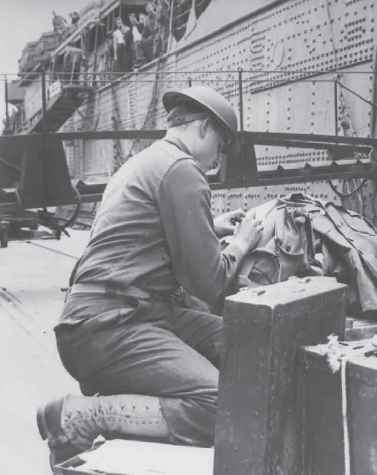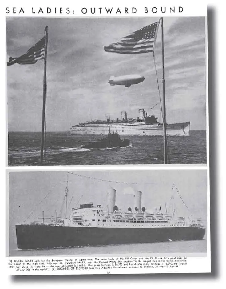 In company with thousands of other doughboys, WACs and nurses, the GIs of Third Army had first to make the dangerous, uncomfortable crossing of the Atlantic Ocean. Many traveled on the Queen Mary (SS490 as she was known in wartime) or on her sister ship the Queen Elizabeth. The impressions gained at the beginning of these voyages were indelibly stamped on the minds of all those who experienced them. The lights, the bustle, the magnificent panorama of New York City, as the harbor boat swung down the East River, around the Battery and up the Hudson. The band playing on the pier as troops transferred to their ocean going home, the Red Cross āDoughnutā girls handing out mugs of steaming coffee, and finally the long climb, with full equipment, up the steep gangplank. Here is how such an embarkation was described by one GI: