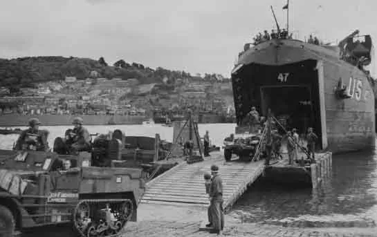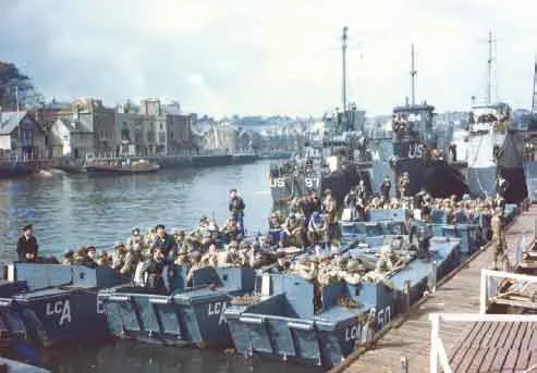 An AA halftrack backs toward LST 47. The next time it will see dry land is on Utah’s Tare Green Beach. In the background, Dartmouth in Devon.