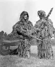 Two snipers of the 1st Canadian Parachute Bn during an inspection by King George VI, Queen Elizabeth, and Princess Elizabeth, on Salisbury Plain, May 17. The snipers wear “ghillie” camouflage suits.