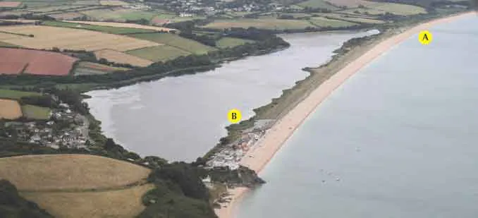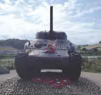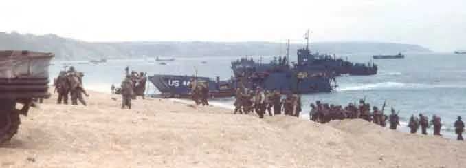 Slapton in Devon was requisitioned by the British Government in late 1943 for use by US forces destined to land on Utah Beach, which Slapton Sands closely resembled. The inhabitants were evacuated (top) at short notice and the US personnel moved in. The US Army later presented a memorial to thank the people of Slapton (right and A in aerial photo). On April 22–28, 1944, Exercise Tiger took place, and during the night of April 27 a convoy of poorly protected LSTs was attacked by E-boats leading to some 1,000 casualties. Forty years later, after tireless work by Ken Small, the full story was told. This M4 (above and B in aerial photo above left) was recovered from the sea and placed at Slapton as a memorial to those who died. The exercise pictured (left) is on Slapton Sands and shows Coast Guard-manned LCI(L)-85 which would be so severely damaged by enemy fire during the invasion that it sank later on D-Day. (See also photo page 118.)
