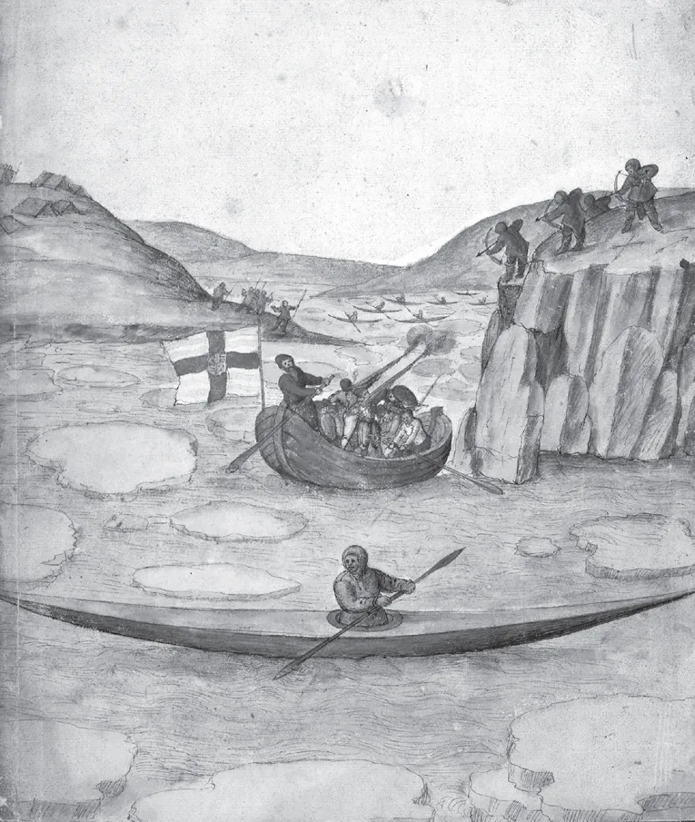 Frobisher at Bloody Point. From the beginning native opposition to English landings was strong enough to dismay but never powerful enough to deter. (British Museum)