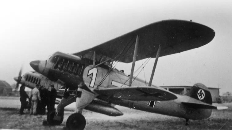 A pair of He 51 fighters of the Reklamestaffel (advertising squadron) Mitteldeutschland from Döberitz, displaying civilian markings; the Luftwaffe had not yet come into being. (Galland)