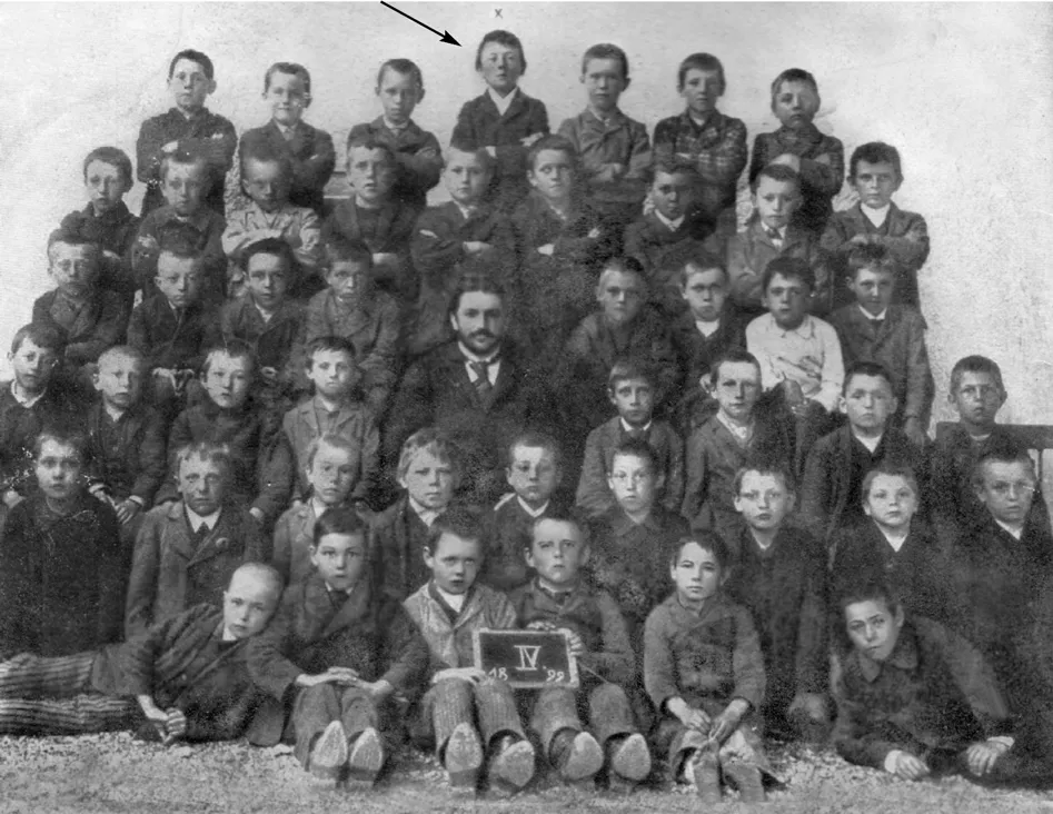 In der Schule. „Der kleine Rädelsführer“ – so bezeichnet sich Hitler selbst in seinem Buch, wenn er über seine ersten Entwicklungsjahre schreibt. Der kleine Adolf Hitler (oberste Reihe, Mitte) mit seinen Klassenkameraden.