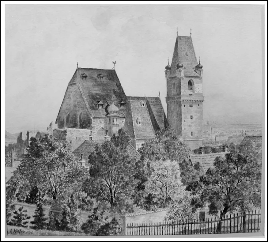 Perchtoldsdorg Castle and Church. Water colour by Adolf Hitler.