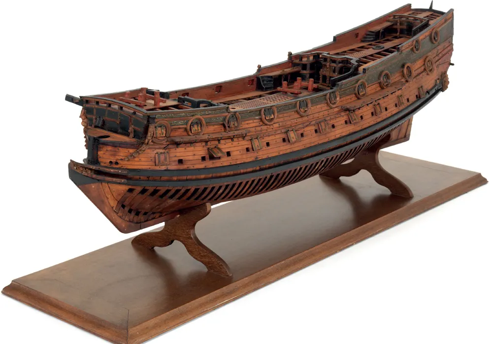 SLR0368 On the basis of its decorative scheme this model is usually dated to just after 1660. ‘The Shearnes’ is painted on the upper counter, but there is no warship of that name, nor any built at Sheerness, that would fit. However, the model has the layout, proportions and, at 1/48th scale, roughly the dimensions of the first Parliamentary frigates, with the long heavily raked stem that was a feature of the time. The model carries a small poop and royalist decorations, but, like the full-size prototype, a model could be modified in the course of its life – and in 1660 republican symbolism was being removed throughout the country, from pub signs to warship names, to demonstrate loyalty to the newly restored King Charles II.