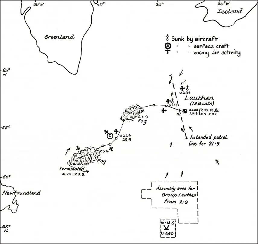 Some of the U-boat commanders were evidently disregarding the order to proceed to their positions submerged, for on the morning of 19th September a British aircraft reported from a little eastward of the intended patrol line Leuthen that she had attacked a westbound U-boat22 and obtained four possible hits. During the afternoon some indecipherable radio messages came in, which we presumed to have been made by the U-boat attacked. This signal activity was undesirable, since it was bound to betray the presence of the boats.