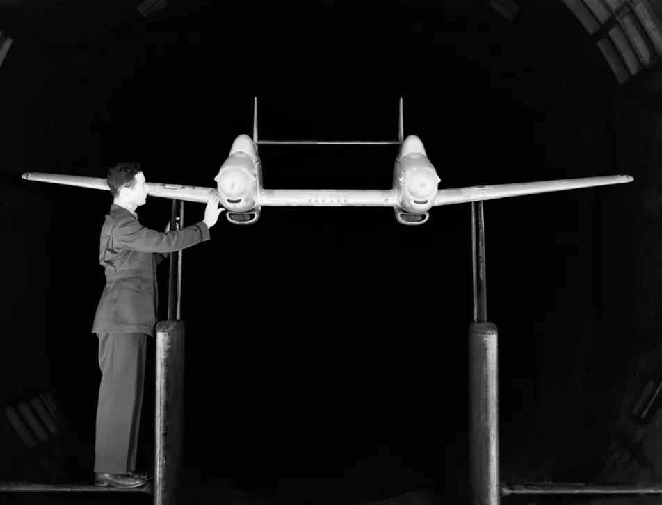Frontal view of XP-82 scale model about to undergo wind tunnel testing by the National Advisory Committee for Aeronautics (NACA) Ames Research Center during late 1944. (NASA)