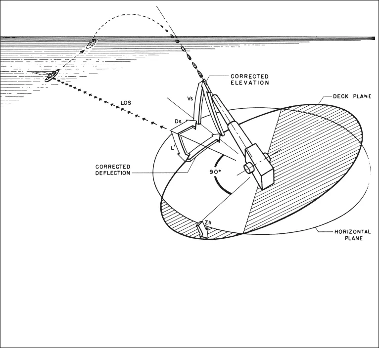 Before World War I the rolling ship motion that gunners tried to cancel out moved the gun barrel almost directly up and down, as it pointed along the broadside. Guns pointing closer to fore and aft were affected by trunnion tilt, the effect of which is shown in this diagram from the 1950 edition of the US Navyâs gunnery manual. The US Navy called the effect cross-roll, and the fixed stable vertical (Mk 32) introduced in the 1930s made it possible for a ship to fire at a selected point in the cross-roll. By World War II remote power control made it possible for guns to move to cancel out cross-roll altogether. This diagram shows the effect of trunnion tilt and the sort of corrections needed to deal with it. LOS is the line of sight to the target, the line in which a director not corrected for cross-level would point a gun. The gun is mounted in the deck plane, and it is aimed with respect to that plane, but fire control is calculated for a horizontal (non-rolling and -pitching) plane. Until after World War I, navies assumed, in effect, that guns would be fired on the broadside, and that correction had to deal only with the rolling motion of the ship that in effect elevated and depressed them. World War I showed that ships would often fire close to the fore and aft line, so that trunnion tilt might be just as important as the up and down movement of the line of sight. Dealing with trunnion tilt required correction in both train and elevation, but train was the more important error.