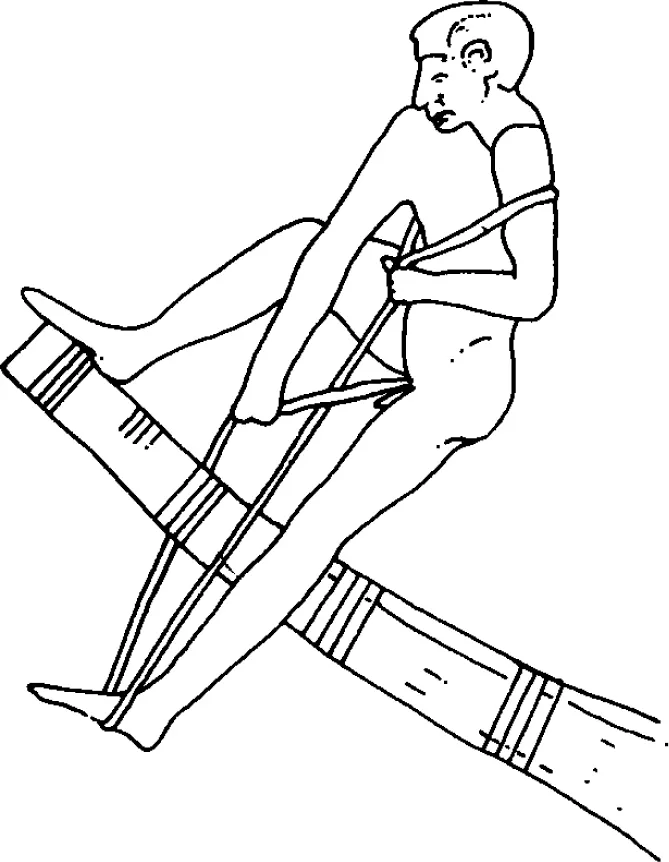 Illustrations and models from Egyptian tombs can readily be found depicting just about every conceivable building action, and every operational use of a boat or raft. For example, see Fig. 1.4 in which a man uses his foot to tighten the bindings of a reed bundle raft. Furthermore, boatbuilding scenes depicted in the Fourth Dynasty chamber of Rahotep at Medum, the Fifth Dynasty mastaba of Ti (Fig.1.5) and the rock tomb of Nefer (both the latter at Saqqara), and in the Sixth Dynasty tomb of Mereraka, include illustrations of the following techniques: