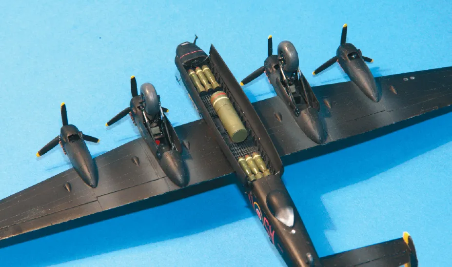 The final phase covers the bomb bay, undercarriage, propellers (all with individual blades!) and the turrets. None of these are easy or quick to assemble, in particular the seemingly endless angle brackets for the bomb bay side walls. As an aside, the reason that the rear of the H2S radome was left unpainted was that it covered two of three downward i/d lights. There are a number of small aerials and details to fit before the bomb-doors can go on to complete the model.