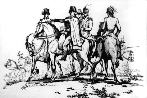 Wellington and his staff at Waterloo. The duke is shown wearing his cape, and while most of his officers wear the staff uniform, the aide in the shako and the 1812 light dragoon uniform must be intended to represent his ADC, Lord George Lennox, son of the Duke of Richmond, a lieutenant in the 9th Light Dragoons. (Engraving by S. Mitan after George Jones, published 1817)