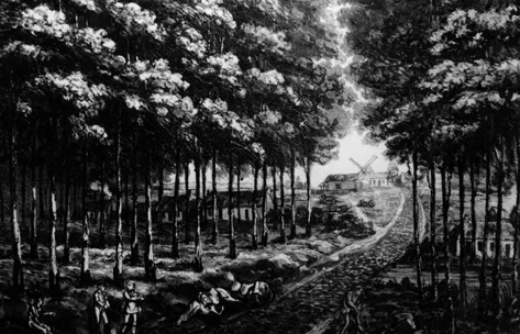 The ForĂȘt de Soignes: the thick woodland in the rear of Wellingtonâs position at Mont St. Jean, which by conventional wisdom could have hindered a withdrawal; but the duke and others believed that if the army had been driven off the ridge, they could have held the woods against all comers. (Engraving by and after J. Rouse, published 1816)