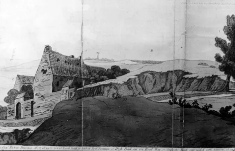 La Haye Sainte: an early view, evidently drawn by Charlotte Waldieâs sister Jane, later Watts, showing the damage of battle. The excavation or âsandpitâ and higher ground at right is that defended by the 1/95th, at the right flank of the 5th Divisionâs position. (Print published by Booth, 1816)