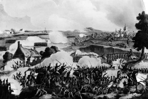 Waterloo: French cavalry attacks part of the line held by the 5th Division, with La Haye Sainte at left and the sandpit in mid-ground, centre. (Print by T. Sutherland after William Heath)