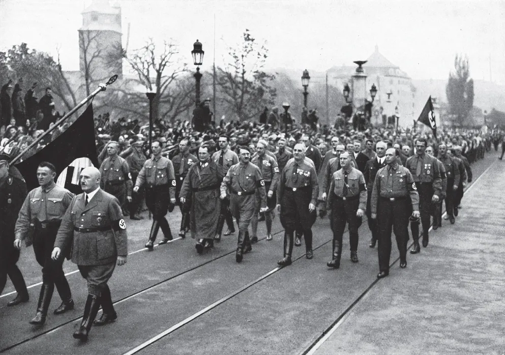 Adolf Hitler never cared about his own person. For example, when on November 9th, with ultimate determination, he marched from the BĂŒrgerbrĂ€ukeller, at the head of the column, which broke down under a shower of bullets in front of the Feldherrnhalle or when on the fatal morning in Wiessee, accompanied by only a few faithful followers, with his own hand he arrested the traitors.
