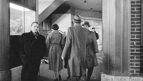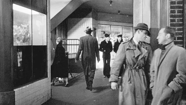 With long, purposeful strides, Manny walks into the Victor Moore Arcade in Queens (12:39â50). He is bound for the office of the Associated Life Insurance Company, where he hopes to borrow money on his wife Roseâs policy, but will instead be mistakenly identified as the man who held up the office a few weeks before. Though neither he nor the first-time viewer can know this yet, he is on his way to becoming the Wrong Man: behind him, his prudently overroutinized world of work and family; ahead of him, the disciplinary gulag of police, prison, and law court. The neorealist authenticity of a location shot does not quite conceal the mythic decor of a Portal. In approaching the infernal space of his ordeal, Manny must traverse a narrow, congested passageway; he is filmed from behind, denied all liminal affect, as though to suggest that he crosses this symbolic threshold without recognizing it as one. And just as, for Manny, this moment of transition would be only âdead timeâ between his intention and its realization, so, for most theatrical viewers, it is no more than descriptive filler interposed between important narrative articulations.