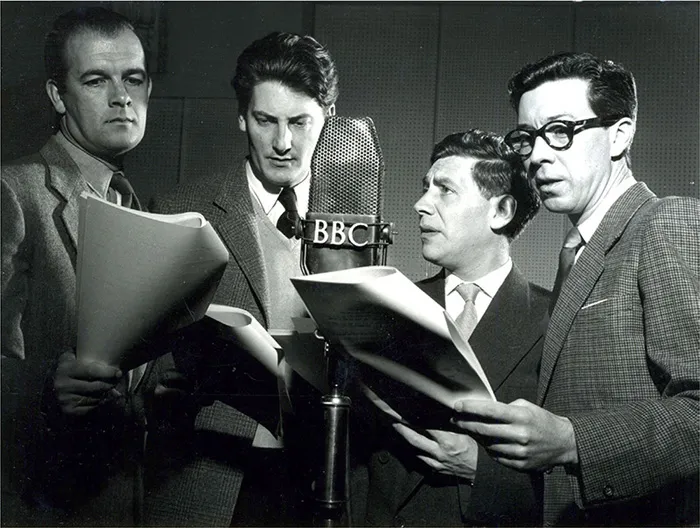 The cast of Journey Into Space stand by for take-off around the microphone. Left to right, they are Don Sharp as Stephen Mitchell or Mitch, Andrew Faulds as Jet Morgan, Alfie Bass as Lemmy Barnet and Guy Kingsley Poynter as Doc Matthews.