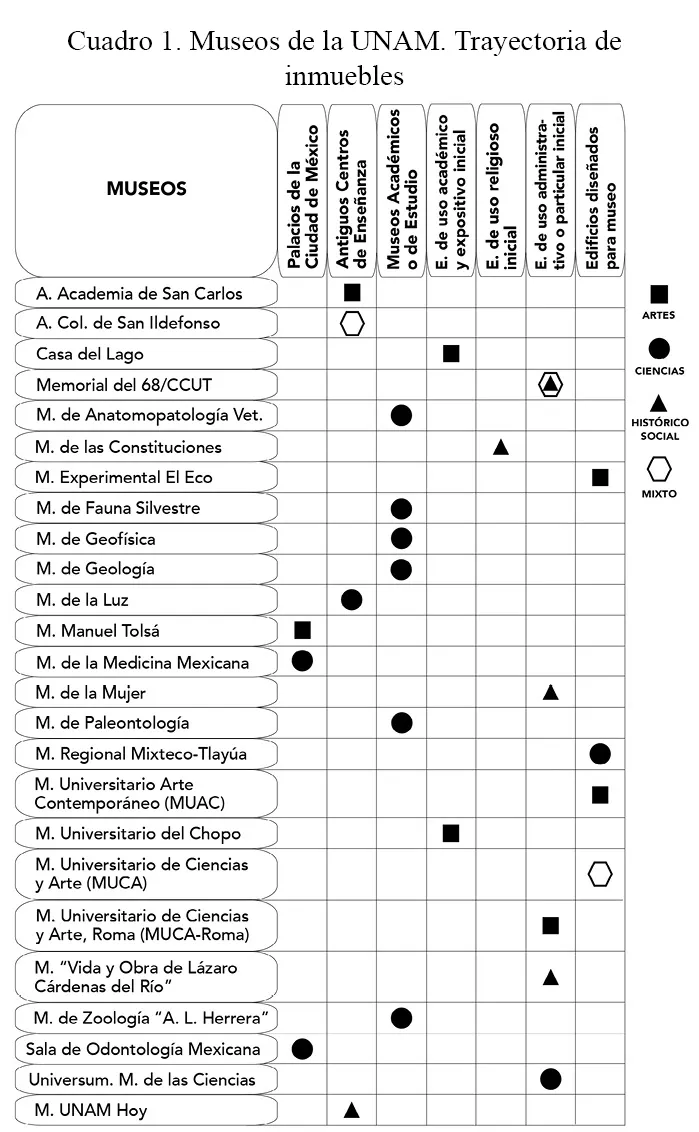 En cuanto al uso museográfico de estos inmuebles, esta clasificación no es definitiva, ya que cada uno tuvo una trayectoria diferente, como diferente ha sido también su proyección en la comunidad universitaria y en la sociedad en general.