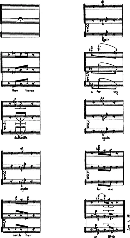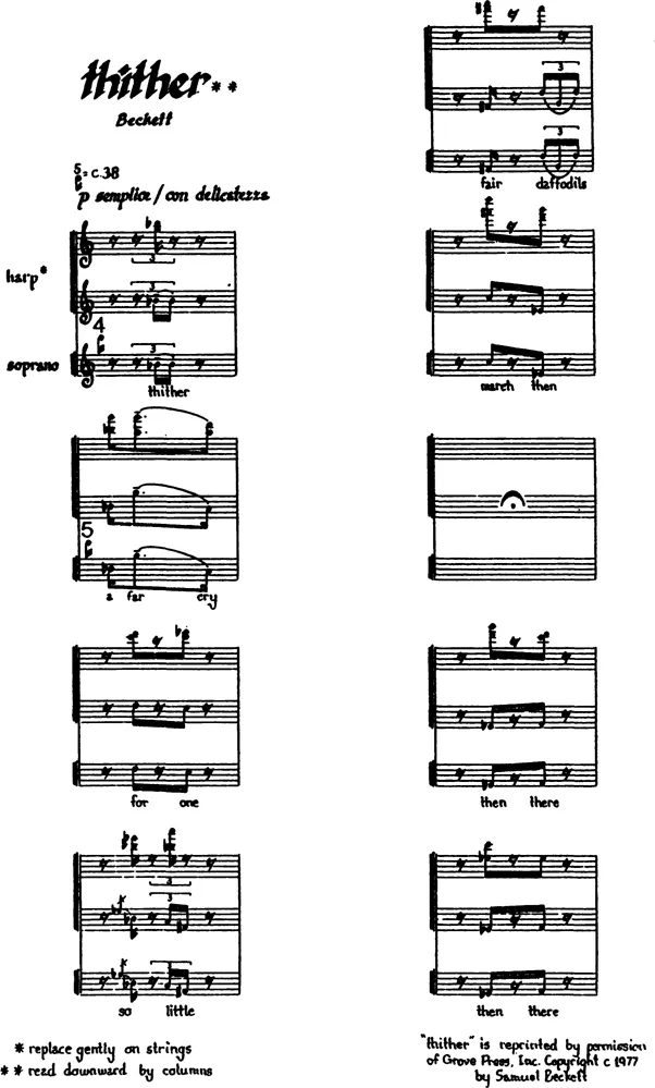 âthitherâ for soprano and harp is part of a song cycle entitled Now and Then. *The formal design of the poem is reflected in the focal line of the music which also finds its echo in the harpâs doublings.The music is notated in vertical columns, rather than horizontally, to reflect the visual design of the poem. Pauses and silences are dictated by the spacing of the lines. Overlappings and repetitions of single words gently insist on images of innocence, vulnerability and the ominous threat of annihilation.Words, voice and harp all merge into oneâeach accompany each other.