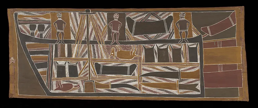 Figure 1.1 Mawalan Marika, Macassan prau, c.1960. This bark painting depicts three fishermen on the deck of a prau, a goat and a bird, sacks of rice and the knives for slicing the trepang harvested by the Macassans.