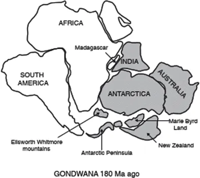 The continent we now know as Australia was once (600 to 100 million years ago) part of the ancient primeval continent of Gondwanaland whose swamp forest, birds and fish left the legacy of extensive coal beds in what later became south and eastern Australia. From 90 million years ago, Gondwanaland drifted eastward, separating from Antarctica and New Zealand (Figure 1.2). The intervening seas allowed cold ocean currents to converge around the separating landforms. Gondwanaland began to break up and a gigantic inland sea divided the Australian continent. Sediments from this time remain in their original horizontal positions across western Queensland, and north-western South Australia, forming the vast groundwater trap known as the Great Artesian Basin. The Great Divide on the continent’s eastern rim began to rise rapidly, the Tasman and Coral seas opened and the ancient inland sea now became land. Carbonate sedimentation occurred on the margins of the continent, which laid the foundation for the Great Barrier Reef and the broad limestone Nullarbor Plain. Having reached its current latitudinal position, the continent became monsoonal in the north, covered by a type of rainforest, and arid in the dry centre (Henderson and Johnson 2016, 299ff).