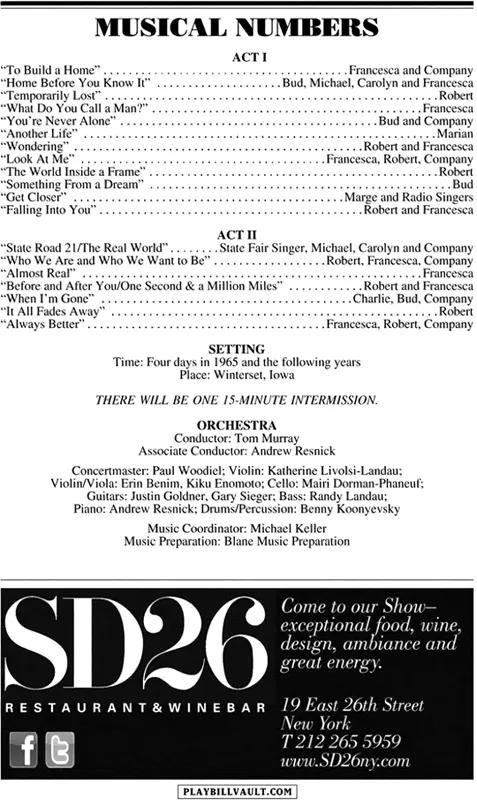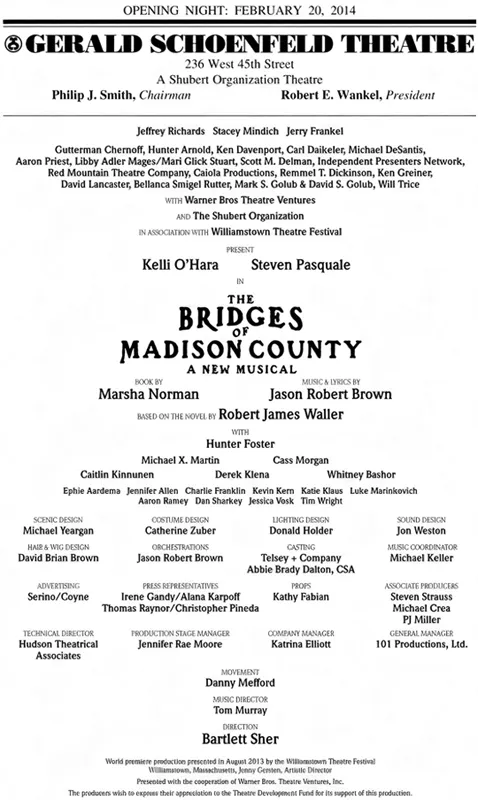 It was Marsha Norman who pitched the idea of turning Bridges into a musical to Jason Robert Brown. The pair had had a rewarding, if brief, first collaboration of the theatrical sort. In 2011, Norman penned an adaptation of E.B. White's The Trumpet of the Swan, a 1970s children's story. The concept was straightforward and poignant: A swan, born without a voice, learns to play the trumpet to attract a beautiful swan named Serena, using professional actors and a live orchestra playing original music. In an interview, Norman explained that “there's no costumes, no set, no dancing and no singing,” having previously described it, “like Peter and the Wolf; dramatic reading with full orchestra paints the pictures.” Brown completed the score within a few weeks.