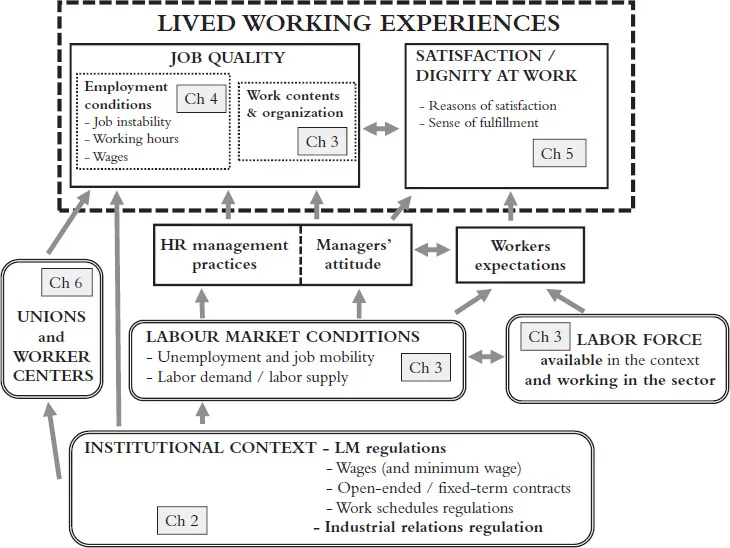 As explained in the introduction, the structure of this book is interlinked with the analytical framework that guided my research. It aimed at considering jointly the role of the institutions, the labor market conditions and the labor supply, on the one hand, and their impact on the workersâ lived experiences on the other. Figure 1.1 shows the interplay between several factors and highlights the guiding thread of the analysis (see references to the bookâs chapters). Before explaining the role that each dimension plays in the analysis, it is worth making clear the three peculiar and innovative features of my approach.