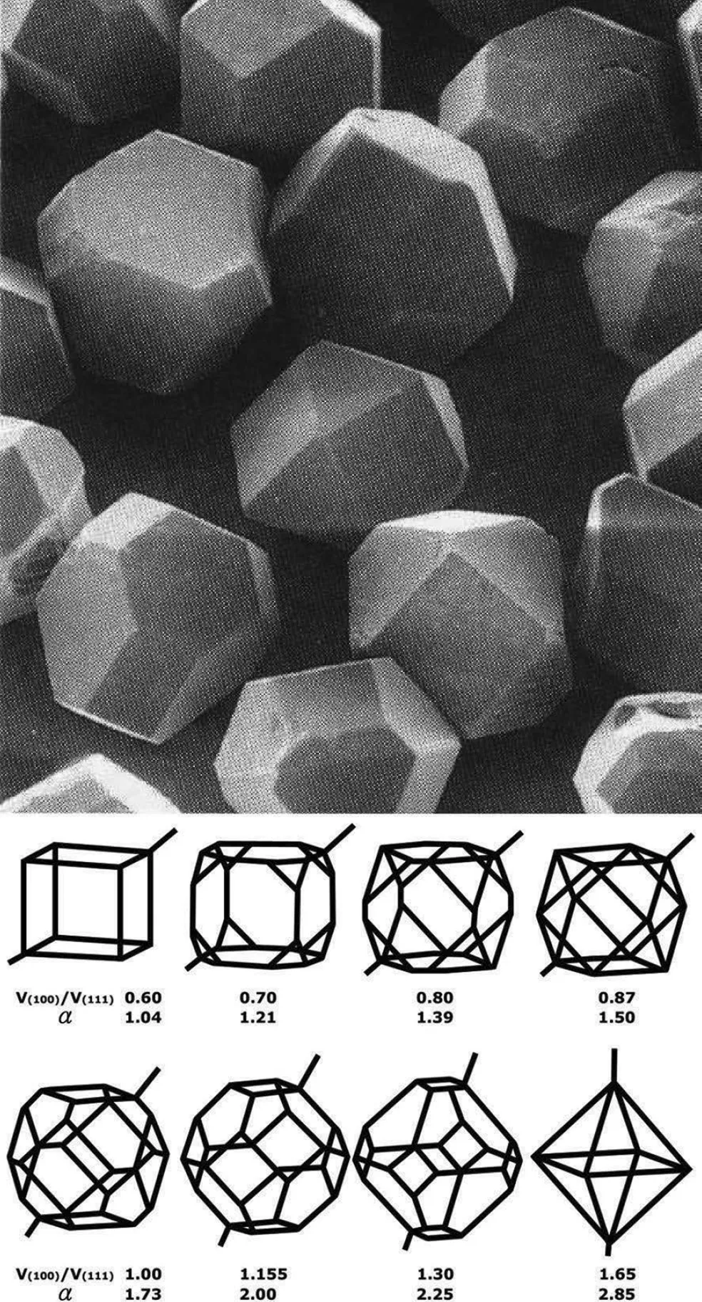 Figure 1.1 The premium saw grit possesses euhedral crystal shape (top). The crystal is cubo-octahedral (bottom with its shape that tends to be more octahedral when it is growing at a higher temperature. In the bottom diagram, the fastest direction of diamond growth (the largest size of the crystal) is measured by α = √3V(111)/V(100), where V is the growth rate in the direction perpendicular to the particular face.