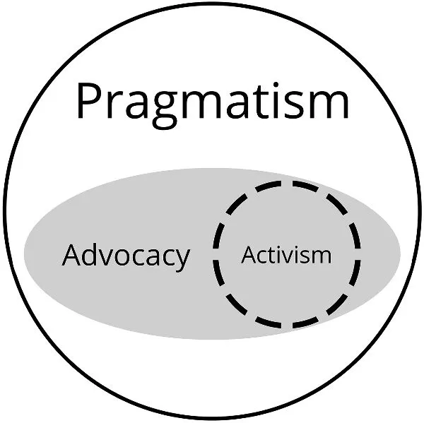 TPC has always had a pragmatic orientation, focusing on the direct application of practice and making improvements to it. As Jones, Moore, and Walton (2016) point out, the official, traditional narrative of TPC is âa pragmatic identity that values effectivenessâ (212). However, a sole focus on pragmatism and an ethic of expediency can be damaging and dangerous (Katz 1992). Documents and designs can intentionally function to disenfranchise marginalized groups (Jones and Williams 2018) and can efficiently achieve their desired results. Interrogating and disrupting the idea that technical communication is neutral is necessary to recenter the needs and concerns of the marginalized (Haas 2012). This first heuristic helps reorient pragmatism through a social justice lens. As shown in figure 4.1, we characterize all of TPC work as pragmatic, and then nest two additional characteristicsâadvocacy and activismâwithin. Considering the work in this way helps researchers conceptualize their approach and can move their work from a sole focus on pragmatism and shift towards advocacy and activism.
