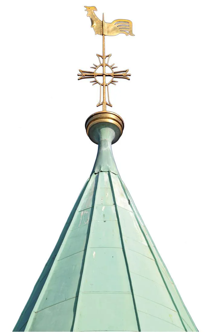 Auf vielen Kirchturmspitzen ist oben ein Hahn befestigt, der uns an den heiligen Petrus erinnern soll. Als Jesus zum Tod am Kreuz verurteilt wurde, hat Petrus geleugnet, zu ihm zu gehören. Dreimal wurde er gefragt: „Gehörst du nicht zu Jesus?“ Jedes Mal antwortete er: „Nein, ich kenne Jesus nicht.“ Kurz darauf krähte ein Hahn (Markusevangelium Kapitel 14, Verse 66–72). Auf Bauernhöfen weckt ein Hahn am frühen Morgen Menschen und Tiere und kündigt den Tagesbeginn an. Der Hahn auf dem Kirchturm erinnert uns daran, dass Jesus als das Licht der Welt zu uns gekommen ist. Er ruft uns vom Kirchturm aus zu: „Seid wachsam! Haltet zu Jesus! Bleibt ihm immer treu!“ Der Hahn erinnert uns daran, dass wir zu Jesus gehören.