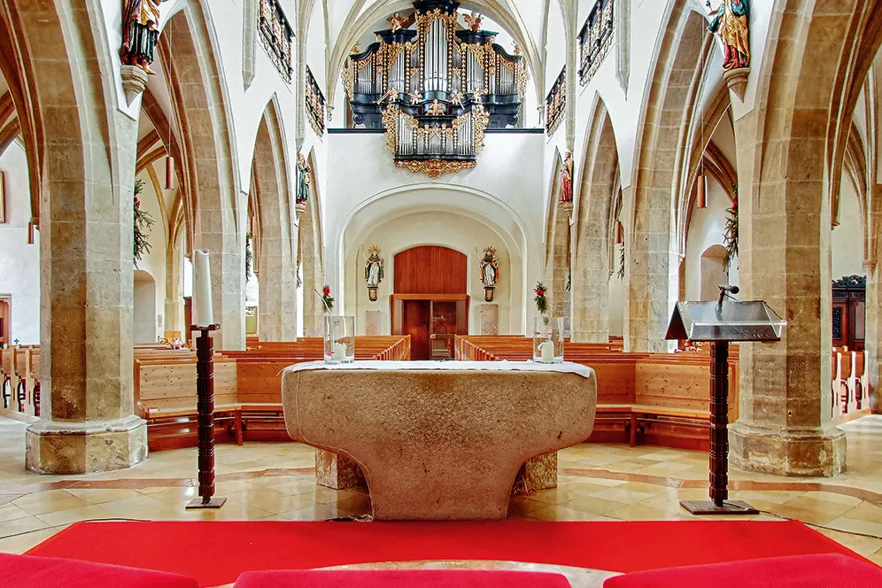 An der wichtigsten Stelle im Haus Gottes steht der Altar aus Holz oder Stein. Er ist der Mittelpunkt bei jedem Gottesdienst, denn hier feiert der Priester mit der Gemeinde das heilige Mahl. Auf dem Altar liegt ein weißes Tuch, in das oft die Buchstaben „IHS“ eingestickt sind. Das ist ein so genanntes Christusmonogramm, also eine Abkürzung für den Namen Jesus. Es wird auch auf Hostien gepresst.