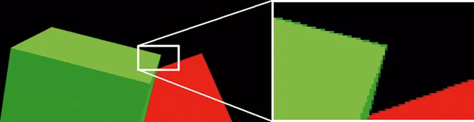 From a more technical, lower-level perspective, rendering a scene produces a raster—an array of pixels (picture elements) which will be displayed on a screen, arranged in a two-dimensional grid. Pixels are typically extremely small; zooming in on an image can illustrate the presence of individual pixels, as shown in Figure 1.3.