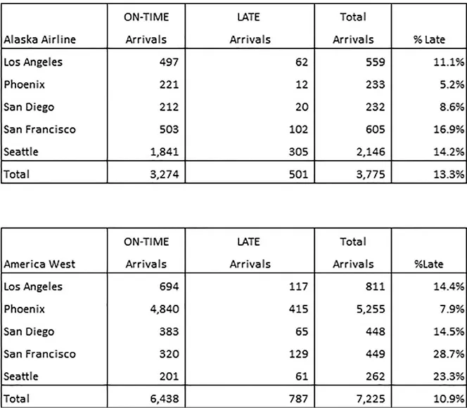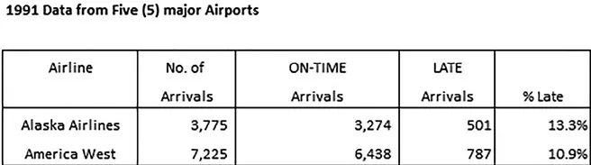 Consider the following data derived from a 1991 record of flight arrivals. In 1987, the Department of Transportation required all US airlines to report data on whether the arrival is late or on time. For now, letâs look at the comparison between Alaska Airlines and America West.