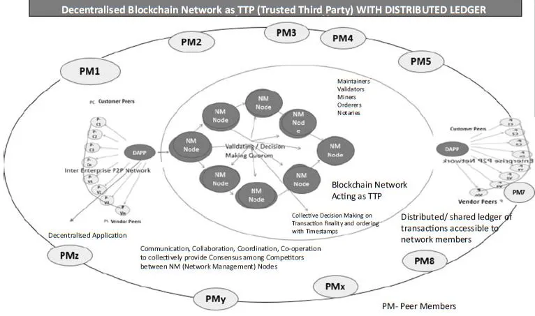 - A network of nodes undertaking to verify and propagate the transactions generated by the participants.
