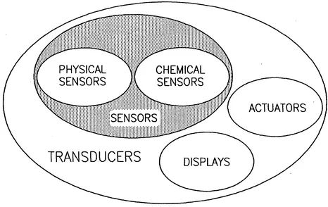 Classification of sensors and related devices is a very popular activity, as usually at least one paper at each sensor conference is devoted to this topic. Classifications have been made according to signal domains (Middelhoek and Noorlag 1981, Middelhoek and Audet 1987), electronic components (Bergveld 1986), transduction modes (Janata and Bezegh 1988), applications (Kobayashi 1985) and biological criteria (Aizawa 1983, Lewis 1985). Because every classification has its exceptions and problems, there is some confusion over terminology. The following clarification of sensor jargon gives an overall view and is of course also subject to discussion.