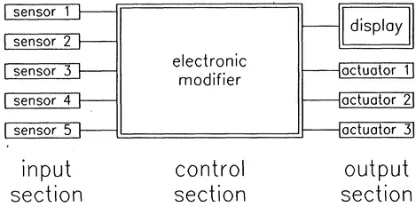 Figure 1.2 Schematic of a universal control system consisting of sensors, an electronic modifier, actuators and a display.