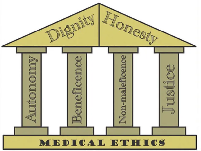 Ethics and moralities are at the core of human civilizations. Morals are the individual principles or oneâs conscience, while ethics are the rules and regulations provided by external sources. Ethical practices in the medical profession are of utmost importance. In fact, this profession needs to be more ethical than any other profession as it is directly related to the patientsâ health and their lives. Ethical issues are directly associated with life and death. The ethical practices of the medical profession are also known as âclinical ethics,â and their goal is to improve the quality of patient care. It is the ethical obligation in medical practices to be competent and to have respect for the patients and their health decisions and maintaining the primacy of the patientâs need even under political, economic, and social pressure (Nandi 2000). Trust and respect are two essential principles needed to maintain a good relationship between the doctor and the patient. It is the ethical obligation of medical practitioners to recognize their responsibilities toward the patients and society. According to the principles of medical ethics, the doctor should be dedicated to delivering excellent medical service. In the context of the medical ethics, Beauchamp and Childress (2001) have presented four fundamental principles of medical ethics: (1) respect for autonomy, (2) beneficence, (3) nonmaleficence, and (4) justice. In respect to autonomy, the medical practitioner is expected to respect the right of the patient to accept or refuse any treatment. Beneficence refers to the doctorâs duty to act in the best interest of the patient. Nonmaleficence means to not harm the patient, while justice refers to the equal and fair treatment of every patient regardless of his/her social, economic, and political status. These four principles of medical ethics are the pillars of medical ethics on which the edifice of the medical profession rests. Apart from these four principles, Pierre (2014) adds honesty and dignity as two additional principles of medical ethics (see fig. 1).