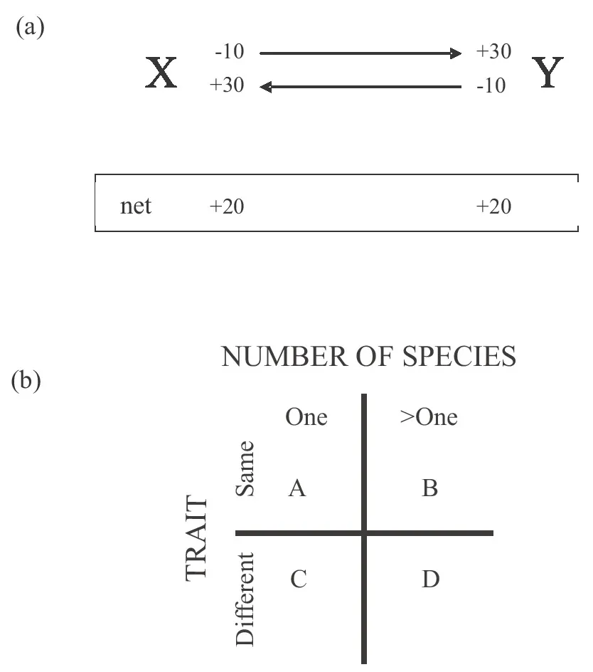 Most alliances are founded on reciprocity, that it is advantageous to help another organism only if the favor is returned. In a two-organism system, reciprocity requires that each of the organisms places a higher value on what it receives (benefit) than what it gives (cost) (figure 1-1a). For example, the relationship between mycorrhizal fungi and plant roots is underpinned by the transfer of photosynthetic sugars from plant to fungus, and of phosphate in the reverse direction. Photosynthetic carbon is cheap for the plant to produce but a critical resource for the fungus, which cannot utilize the polymeric carbon sources in soil. Inorganic phosphate is relatively immobile in soils, and is acquired more readily by the fine, branching fungal hyphae than by the relatively massive plant roots with short, nonbranching root hairs. The one situation where reciprocity as depicted in figure 1-1a does not apply is between closely related organisms. Here, kin selection is important: genotypes that help relatives (i.e., individuals with many genes in common) increase in frequency and are at a selective advantage over genotypes that do not help.