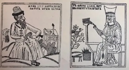 FIGURE 1.1 The husband manufactures sandals while the wife spins thread. Lubok. From Russkii lubok XVII-XIX vv (Moscow-Leningrad: IZOGIZ, 1962). © 19th century, public domain.