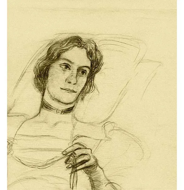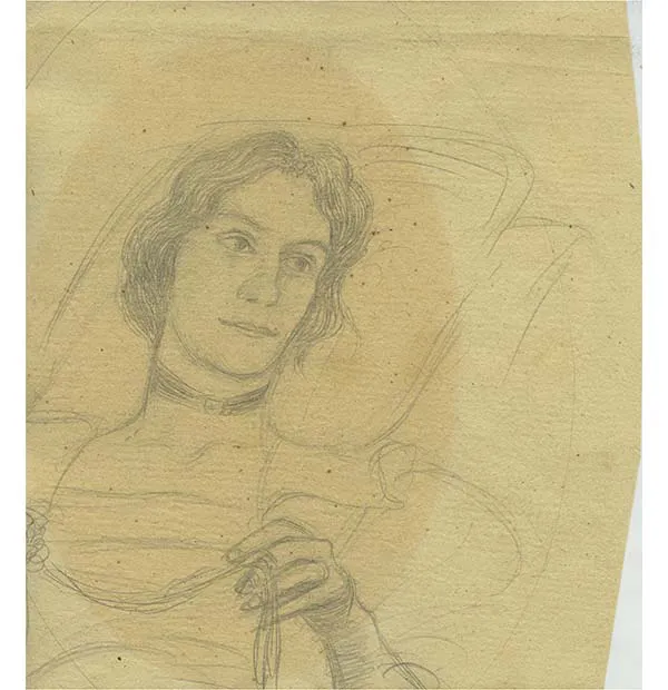The earlier one (Portrait 1), drawn in pencil on paper that is now slightly foxed, is a quarter-length portrayal of a woman who looks to be in her late twenties or early thirties (Plates 1–2). The handsome face is turned slightly to the left (the viewer’s right). The head is carefully drawn, as is the left hand, which is raised and turned in front of the body in such a way as to display a ring on the fourth finger, with two long, thin bands of material running over and through the fingers. The bands come loosely across the chest from a floral object, which appears incompletely at the left edge of the drawing. Although it is possible that the bands are fine chains, which were sometimes looped and pinned across the bodice, they are more plausibly interpreted as ribbons attached to the floral object, which in that case is to be identified as a bouquet rather than a floral brooch. A choker, probably a ribbon-band or possibly composed of very fine beads, with a shield-shaped front clasp or slide, is worn on the neck, and a cluster-ornament across the parting of the hair at the front. The rest of the drawing is decidedly sketchy, but it can be seen that the dress is heavily padded at the shoulders. Behind the head is the outline of what is almost certainly a cushion or pillow, and to the right of that the outline of what is probably part of a cushion or pillow or chair.