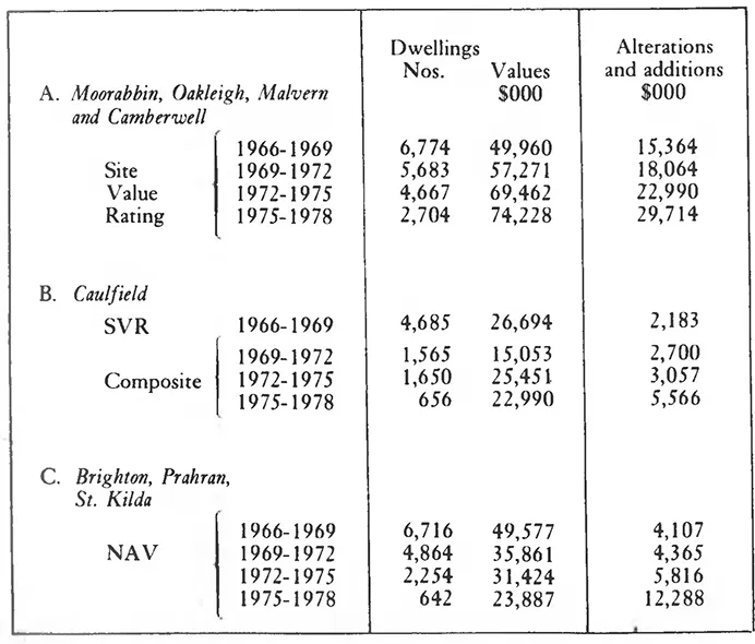 In 1969-70, Caulfield switched from the site-value basis to the ‘composite' basis of taxation (popularly known as the ‘shandy' system) under which half of the rates are on site value and half on the value of land-plus-improvements. The immediate consequence was a dramatic drop in the number of building permits sought by developers. Although building permits issued for 1969-72 dropped by 16% over their level in the previous period for the SVR cities, they dropped by 66% in Caulfield. This sensitivity to the property tax has been traced in other urban areas in Australia. Usually, however, the marked change has been in the opposite direction; with the progressive untaxing of buildings by local authorities switching to site value rating, there have been sudden increases in the number of applications for building permits.