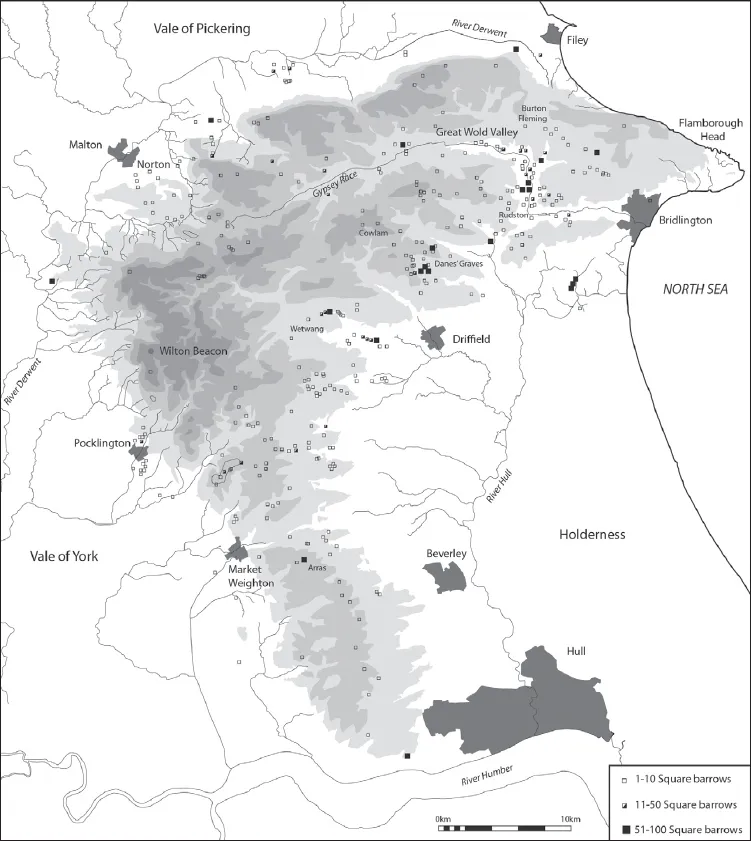 It is the funerary evidence which dominates accounts of the region. From around the fourth century BC to the mid-first century BC, inhumations became increasingly numerous. Small groups of square barrows (such as Cowlam) or isolated graves, contrast with larger cemeteries at Arras, Danes Graves, Burton Fleming, Rudston and Wetwang/Garton Slack. The largest cemeteries are usually found in the base of valleys at the edge of the Wolds dipslope, or clustered along the Great Wolds Valley (Figure 1.3). However, smaller cemeteries are also found in Holderness and the most northerly barrow cemetery has been recorded at Slingsby in North Yorkshire, with outlying chariot burials discovered on the North Yorks Moors and in West Yorkshire.