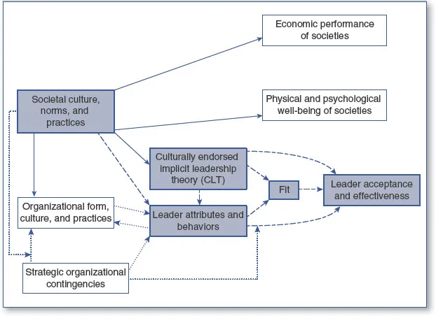 The GLOBE theoretical model (House et al., 2004) was proposed as a fully integrative theory linking culture, leadership, and organizational effectiveness. The theory not only relates national culture to aspects of leadership and organizational processes but also asserts that culture has a sustained influence on societal human welfare and the economic success of that culture. Our theory, which continues to guide the GLOBE research program, is an integration of implicit leadership theory (ILT) (Lord & Maher, 1991), valueābelief theory of culture (Hofstede, 1980; Triandis, 1995), implicit motivation theory (McClelland, 1985), and structural contingency theory of organizational form and effectiveness (Donaldson, 1993; Hickson, Hinings, McMillan, & Schwitter, 1974). We readily acknowledge that the original GLOBE theory has benefited from further research conducted by GLOBE scholars (Chhokar, Brodbeck, & , 2007) and many other cross-cultural researchers (cf. Leung, Bhagat, Buchan, Erez, & Gibson, 2005). Modifications of the original GLOBE model have been made due to research results acquired over two decades of the GLOBE project and from additional knowledge gained by researchers worldwide.