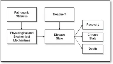 Figure 1.1 is a conceptual diagram of this strong form of the biomedical model. The diagram illustrates a normally functioning person being acted on by some pathogenic stimulus such as an infection, a cancer, or coronary heart disease. The mode of therapy is a direct physical intervention to restore the personâs healthy, well-ordered state. Such therapies may be the administration of an antibiotic to cure a bacterial infection, the application of chemotherapy for a cancer, or coronary bypass grafts for coronary heart disease. All of these treatments have known restorative, if not curative, properties. Their application in individual cases results in one of the three outcomes on the right. We hope that the patient gets better. However, other outcomes also occur, including continued illness or even death.