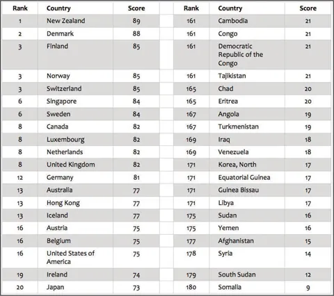 The most widely used measure of corruption is Transparency International’s Corruption Perception Index (CPI). Since the early 1990s, Transparency International has issued the CPI on an annual basis. While not a perfect instrument, the CPI offers a snapshot of national levels of perceived corruption in the public sector. Every year, the CPI’s best performers rarely vary. Six countries have always ranked in the top ten positions – Denmark, New Zealand, Finland, Sweden, the Netherlands and Singapore. The vast majority of nations, however, remain virtually locked in a vicious cycle of relatively high and widespread corruption. The global results of the CPI can be seen in Figure 1 and Table 1, with more details on Christianity, perceived corruption and the amount of foreign aid to a country provided in Appendix 1: Selected Country Data.