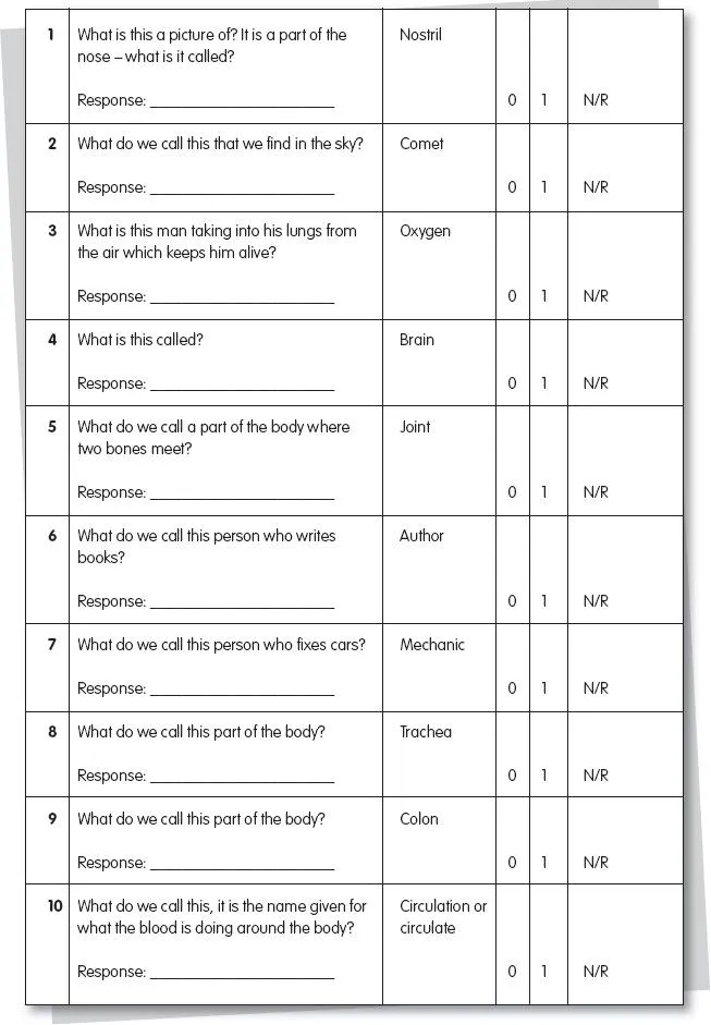 This is a task we used to explore the students’ knowledge of vocabulary covered in the programme before and after the intervention. All you need is a picture of the following test items. The test items are: nostril, comet, oxygen, brain, joint, author, mechanic, trachea, colon, circulation, galaxy, kidney, editor, lecturer, sailor. Show them to the students, and ask them to name each picture. Record errors as well, as these will give you some valuable information about the student’s understanding of the words and how these words are categorised and stored in the mental lexicon.