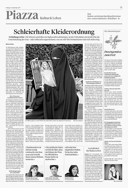 | Fr 15.12.2017 | Luzerner Zeitung / St. Galler Tagblatt (Tageszeitung, NZZ-Mediengruppe) | Verhüllungsverbot: Schleierhafte Kleiderordnung | Hintergrundbericht mit Zweitstoff | Piazza – Kultur & Leben | Melissa Müller |