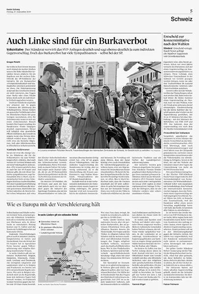 | Do 26.9.2019 | Basler Zeitung (Tageszeitung) | Sogar Linke liebäugeln mit einem Burkaverbot | Bericht mit Zweitstoff | Schweiz | Gregor Poletti |