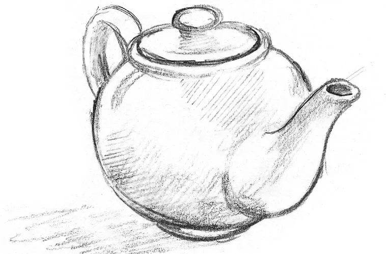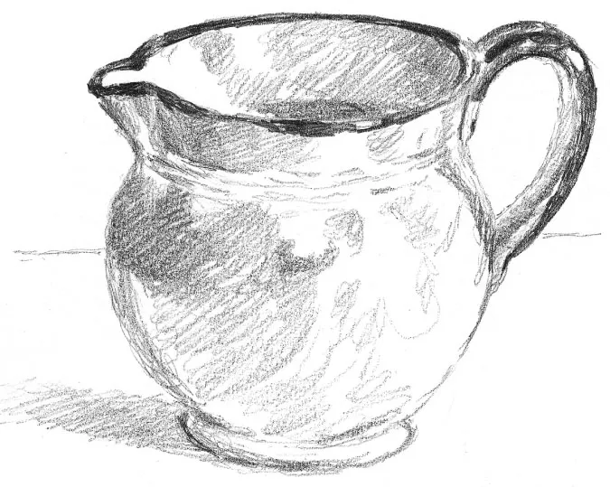 A jug is the next object, but a curved one with a painted rim and handle to make things more tricky. Work on the shape first and then add the tone as before.
